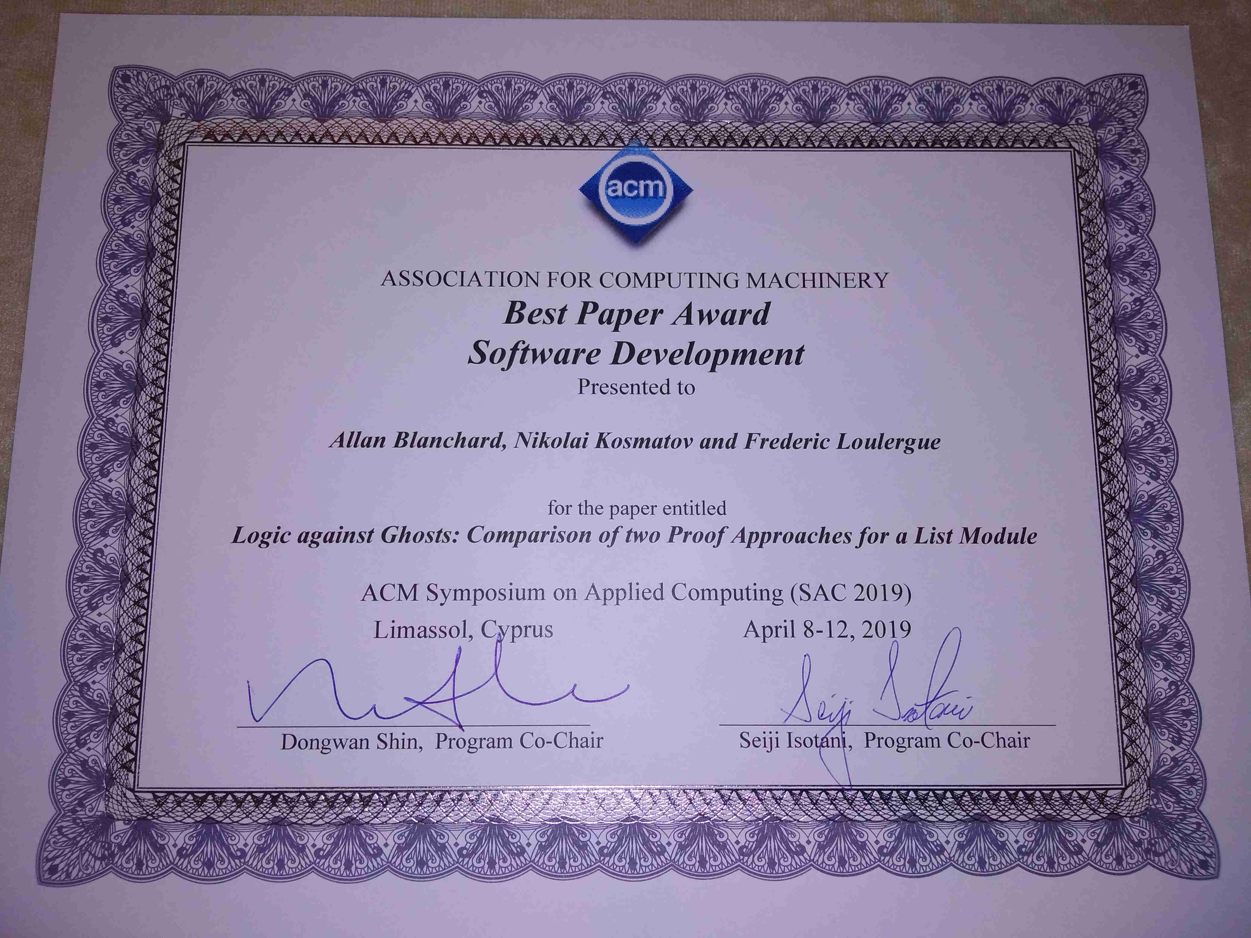 8 April, 2019, Tutorial Formal Verification for an Internet of Secured Things (co-organized with Allan Blanchard and Frédéric Loulergue) at SAC 2019, [slides], [VM with exercises]